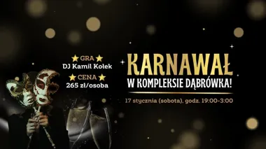 Karnawał w Dąbrówce to wieczór w klimacie balu: miks tanecznych rytmów od DJ Kamila Kołka, strefa bufetów i klasyczna kolacja. Atmosfera ma być luźna i imprezowa — stroje karnawałowe mile widziane.